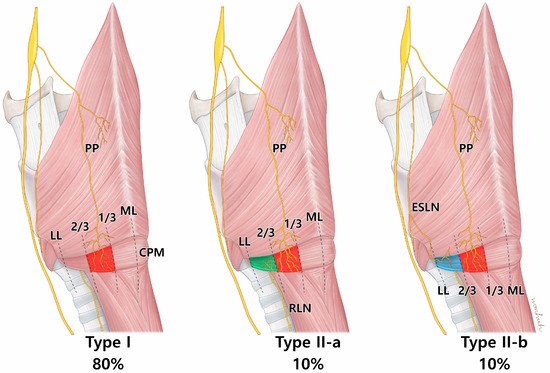 An illustration showing the nerve innervation aspect of the cricopharyngeus muscle (CPM). Type I is characterized by exclusive innervation of the pharyngeal plexus (PP) of the vagus nerve. Type II is characterized by a simultaneous distribution of the PP and branches of the recurrent laryngeal nerve (RLN) or external branch of the superior laryngeal nerve (ESLN). In both patterns, the nerves are mainly localized to the posterolateral side of the muscle. ML; midline, LL; lateral line.