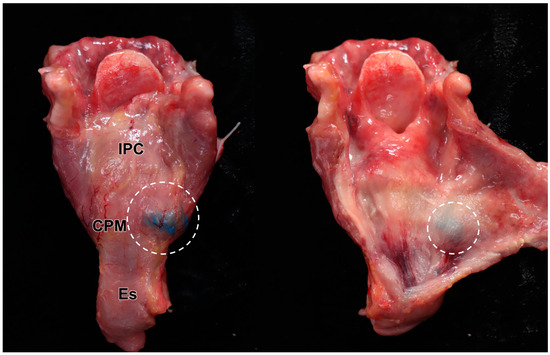 Results of the US-guided injection: The larynx was detached from the cadaver, and the connective tissue was removed, exposing the blue dye localized solely on the posterolateral side of the cricopharyngeus muscle (CPM) (left image). The dye remained strictly confined within the CPM, with no diffusion into adjacent laryngeal structures (right image). The specimen’s darker appearance is due to formalin fixation and preservation. The white circles indicate the injected dye. IPC; inferior pharyngeal constrictor muscle, Es; esophagus.