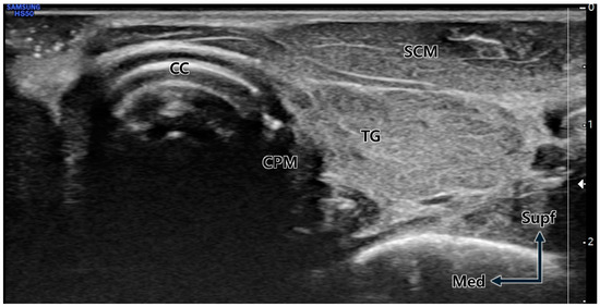 Transverse ultrasound image at the cricoid cartilage (CC) level. Due to the neck rotation to the lateral side, the cricopharyngeus muscle (CPM) is prominently visible immediately lateral (posterior) to the distinctly observed CC. TG; thyroid gland, SCM; sternocleidomastoid muscle, Supf; superficial, Med; medial.