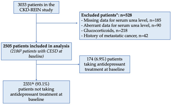 However, our study had a number of limitations. Firstly, it was subject to the selection bias inherent in all cohort studies because depressed patients are often less motivated to undergo follow-up procedures and to answer self-questionnaires. These selection and classification biases might have affected our results concerning the association between the serum urea level and depression by (i) excluding the more depressed patients from inclusion in the cohort and (ii) reducing the number of depression events reported and the number of depressed patients completing the CESD questionnaire. Secondly, the baseline prevalence of depression in our cohort (assessed as being treated with an antidepressant) was 6.9%; this value is lower than those reported for other studies of CKD patients, which range from 26% to 40% (depending on the CKD stages and the depression scale used). This relatively low prevalence could be interpreted by symptoms less frequently reported by our patients and therefore less considered by physicians [1,2,28,29]. Thirdly, the patients with higher serum urea level or a rapid increase in that level were often the most severely ill and were more likely to experience dialysis, initiation, kidney transplantation, or death. As a result, these patients are likely to have been followed up for shorter periods. Hence, data on depression was more likely to be lost because in our study, the active follow-up stopped upon initiation of KRT. Fourthly, the CESD scale was the only scale used to assess the depressive symptom burden in our cohort. In contrast to the full CESD scale, a cut-off score for depression was not validated in the short-form CESD [30]. We were therefore unable to use the CESD score as a criterion for depression (as a disease) in our main analysis. Lastly, and even though we rated the short-form CESD score several times over the 5-year follow-up period, convergence problems prevented us from using a random slope in our mixed models.