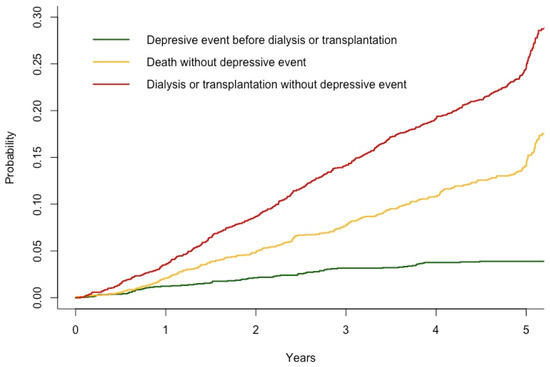 Cumulative incidence of a depressive event, death without a depressive event, and dialysis or transplantation without a depressive event (n = 2331).
