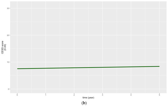 The CESD score was measured at baseline for 2186 patients (Figure 1); the mean (SD) value was 7.5 (5.2). During the follow-up period, more than half of these patients completed the CESD at least four times. The mean (SD) time interval between the baseline measurement and the last measurement during follow-up was 3.8 (1.6) years. Figure 3b shows the predicted linear trajectory of the CESD over the 5 years of follow up, according to the unadjusted linear mixed model (Model 1).