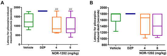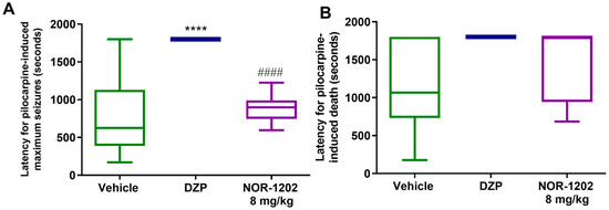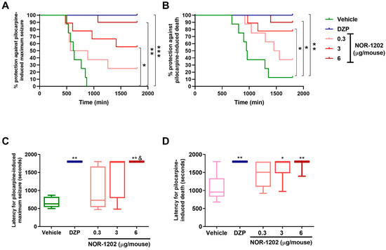 2.2. NOR-1202 Prevented Deaths in Pilocarpine-Induced Seizures, Acute Model