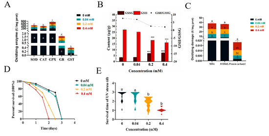 Effect of arecoline on the antioxidant enzyme system and non-enzymatic antioxidant system of C. elegans. (A) Oxidizing enzyme; (B) GSSG and GSH content; (C) MDA content, 8-OHdG content and protein carbonyl content; (D) UV stress; (E) mean survival time of UV stress. Values followed by the different lowercase letters within a row represent the significant difference (Tukey tests, p < 0.05). *** Statistical significance at p < 0.001. One-way ANOVA with Tukey post hoc test.