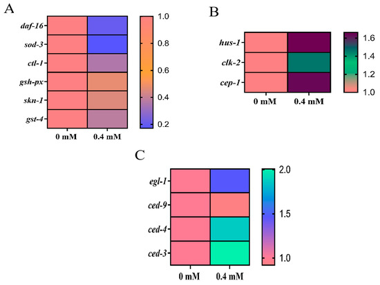 The DNA damage response often induces the development of apoptosis. The genes hus-1 and clk-2 are key genes for DNA damage-induced apoptosis, and cep-1, as a homolog of oncoprotein p53, is a downstream gene of hus-1 and clk-2 in nematodes; these genes can respond to the relationship between the DNA damage response pathway and induced apoptosis. Therefore, we further examined the expression of these genes. It was found (Figure 5B) that the relative expression levels of the hus-1, clk-2, and cep-1 genes were all significantly increased. It is believed that apoptosis in C. elegans is mainly related to the transcriptional regulation of several important genes, namely the egl-1, ced-3, and ced-4 apoptosis-promoting genes and an anti-apoptotic gene ced-9. The results (Figure 5C) showed that the expression of egl-1, ced-3, and ced-4 were significantly upregulated, and the expression of ced-9 was decreased, but not significantly different from the control.