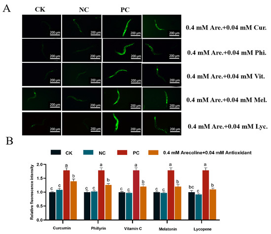 Effect of arecoline + antioxidants on ROS levels in C. elegans. (A) Fluorescence pictures of ROS. (B) Quantification of ROS accumulation. CK: 0 mM; NC: 0.04 mM antioxidants: curcumin; phillyrin; vitamin C; melatonin; lycopene; PC: 0.4 mM arecoline. Values followed by the different lowercase letters within a row represent the significant difference (Tukey tests, p < 0.05). One-way ANOVA with Tukey post hoc test.