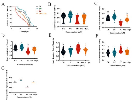 Effect of arecoline + lycopene on the toxicity in C. elegans. (A) Lifespan. (B) Mean lifespan. (C) Body length. (D) Body width. (E) Head thrashes. (F) Body bends. (G) Average number of progent. CK: 0 mM; NC: 0.04 mM lycopene; PC: 0.4 mM arecoline. Values followed by the different lowercase letters within a row represent the significant difference (Tukey tests, p < 0.05). One-way ANOVA with Tukey post hoc test.