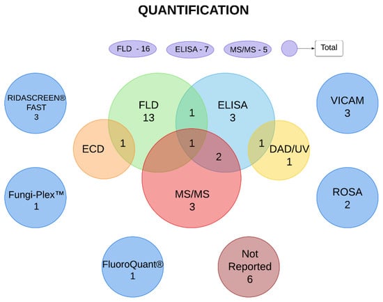 The main methods used for the quantification of mycotoxins were liquid chromatography with fluorescence detection (FLD), enzyme-linked immunosorbent assay (ELISA), and liquid chromatography coupled with mass spectrometry (MS/MS), which were used in 23, 15, and 16 studies, respectively. In addition, rapid one-step assay (ROSA), VICAM AflaTest, Fungi-Plex multiplex mycotoxin assay kit, FluoroQuant AflaTest, and Ridascreen Fast Test were used. Six articles did not describe the quantification methodology. In some cases, more than one test was used in the same study to evaluate one or more mycotoxins (Figure 2 and Table 3).