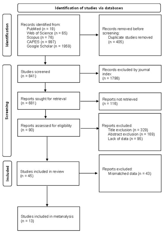 The search was conducted using PubMed, Web of Science, Scopus, Google Scholar, and the CAPES (Brazilian Higher Education Personnel Improvement Coordination) journal portals. The initial search yielded 2597 articles. English was the language used for the search. Only articles published in scientific journals using Qualis A1 to B2 (according to CAPES classification) or SCIMago Q1 and Q2 were included. The searches were conducted from February to April 2024.