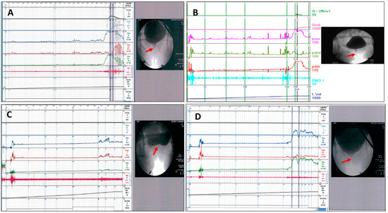 The videourodynamic parameters of the VUDS, including the status of the bladder neck during voiding cystourethrography, first bladder sensation (FSF), cystometric bladder capacity (CBC), detrusor pressure (Pdet), maximum flow rate (Qmax), PVR, and abdominal pressure to void, were recorded and analyzed [6]. The terminologies used in this study were in accordance with the recommendations of the International Continence Society [30]. DO that occurred during the bladder storage phase and before uninhibited voiding were recorded as phasic DO and terminal DO, respectively. The VE (defined as voided volume/CBC), the BOO index (BOOI, defined as Pdet–2 × Qmax), and the bladder contractility index (BCI, defined as Pdet + 5 × Qmax) were calculated from the measured parameters. During voiding, the appearance of the bladder outlet was carefully evaluated. DV was defined by a high voiding Pdet (≥35 cmH2O), a low Qmax < 15 mL/s, and urethral narrowing at the mid-urethra (Figure 1A) or distal urethra (Figure 1B) [1,31]. Patients with a history of transurethral incision for bladder neck dysfunction (BND) (Figure 1C) but who were found to have mid-urethral BOO during a follow-up VUDS were specifically categorized as having BND plus DV. (Figure 1D) Electromyography (EMG) of the urethral sphincter was performed using surface EMG patches to record the pelvic floor muscles’ activity during voiding, which could show intermittency, hyperactivity, or non-relaxation [29]. Repeat VUDS was performed at 6–12 months after the initial diagnosis of DV.