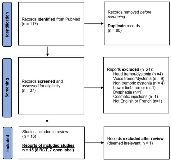 This systematic literature search resulted in 117 findings including 80 duplicates, yielding 37 publications. After screening, 21 manuscripts were excluded because they did not refer to tremor and/or did not target the upper limb or were not in the English or French language (Figure 1). After reviewing all 16 remaining manuscripts, 1 was excluded from the analyses because it was ultimately not considered relevant (a case series of two Parkinson’s disease and five essential tremor patients that was discussing the transition from a unilateral to a bilateral botulinum toxin injection pattern) [18]. In the end, 15 studies were collected for analysis.