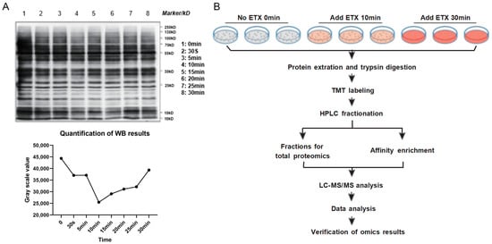 To determine the point times of ETX effects on MDCK cells, immunoblotting was performed. The result is shown in Figure 1A; after being exposed to ETX for 10 min, the phosphorylated proteins were reduced. However, at 30 min, the number of phosphorylated proteins was increased. Therefore, we chose the 10 min and 30 min intervals for the following experiments. The flow chart of quantitative proteome and phosphorylated proteome is shown in Figure 1B.