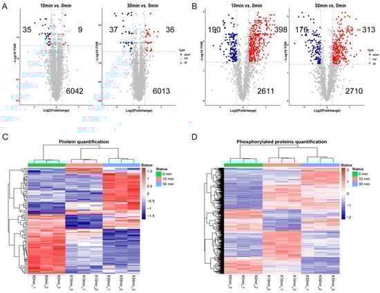 Identification of differentially expressed proteins and differentially phosphorylated proteins. (A) Volcano map of quantitative proteome. (B) Volcano map of quantitative phosphoproteome. (C) Heat map of three quantitative protein groups. (D) Heat map of three quantitative phosphorylated protein groups.