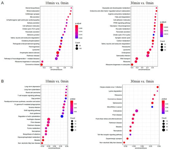 The five enriched pathways with the most significant up-regulated trends in the 10 min group of phosphorylated proteomic data were “T cell receptor signaling pathway”, “Yersinia infection”, “Fc gamma R-mediated phagocytosis”, “long-term potentiation”, and “renal cell carcinoma.” The five pathways with the most significant down-regulated trends were “measles”, “non-alcoholic fatty liver disease”, “glycerophospholipid metabolism”, “Huntington’s disease”, and “necroptosis.” The five enriched pathways with the most significant up-regulated trends in the 30 min group of phosphorylated proteomic data were “Herpes simplex virus 1 infection”, “spliceosome”, “ribosome”, “coronavirus disease”, and “lysine degradation.” The five pathways with the most significant down-regulated trends were “non-alcoholic fatty liver disease”, “dopaminergic synapse”, “necroptosis”, “Parkinson disease”, and “prion disease” (Figure 4B). The specific data are shown in Table S4.