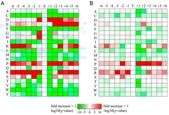 The distribution map of amino acid residues flanking the phosphorylation sites. (A) Distribution of amino acid residues with serine as phosphorylation site. The number of phosphorylated proteins considered was 6028. (B) Distribution of amino acid residues with threonine as phosphorylation site. The number of phosphorylated proteins considered was 619.