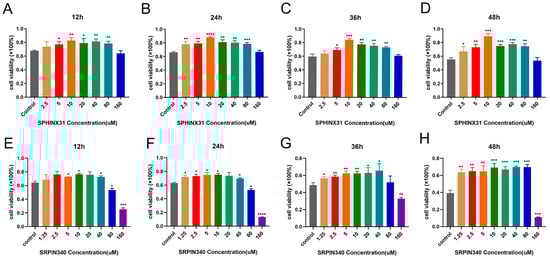 We found that these nine proteins were involved in three pathways, most of which were concentrated in the SR protein complex of the spliceosome pathway. Therefore, we selected SRPK1, a common upstream protein of this pathway, for verification. We used an inhibitor, SPHINX31, that has been shown to be effective in inhibiting the phosphorylation of serine/arginine-rich splicing factor 1 (SRSF1) and is also a selective inhibitor of serine/arginine-rich protein kinase 1 (SRPK1) [,]. MDCK cells were treated with different concentrations of SPHINX31 for 12, 24, 36, and 48 h before being exposed to ETX (8.93 nM), and it was found that the survival rate of MDCK cells was enhanced in a concentration-dependent manner (Figure 7A–D). In addition, SRPIN340 is also an ATP-competing SRPK inhibitor and has been shown to effectively inhibit SRPK1 expression. Similarly, different concentrations of SRPIN340 were applied to MDCK cells, and it can be seen that SRPIN340 could effectively inhibit the death of MDCK cells at low concentrations but had certain cytotoxicity when the concentration was greater than 80 μM (Figure 7E–H). The results suggest that SRSF1 and SRPK1 are involved in ETX-induced toxicity on MDCK cells.