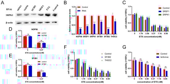 In addition, to further identify the central proteins of MDCK that caused death by ETX, we selected six key proteins on the three key pathways obtained, NOP56, SF3B1, SF3B2, THOC2, SRSF1 and SRPK1, and designed lentivirus to knock down the expression levels of these proteins in MDCK cells, respectively (information on customized lentiviruses is provided in Table S7). The results expressed that ETX could lead to the increase of SRPK1 in MDCK cells, and the use of the four lentiviruses could reduce the expression of SRPK1 in MDCK cells (Figure 8A). In addition, the levels of these six key proteins in MDCK cells were also knocked down by corresponding lentiviruses (Figure 8B). The results of the cell cytotoxicity assay showed that the specific knockdown of SRSF1 and SRPK1 by lentivirus could effectively inhibit the cell death of MDCK cells (Figure 8C), which was consistent with the results of previous inhibitors. However, NOP56 does not play a role in cell death, and decreased SF3B1 expression can promote the death of MDCK cells (Figure 8D,E).