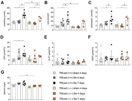 2.2. Renal Injury Is Less Pronounced in TMLed (−/−) Stx Mice at Day 7