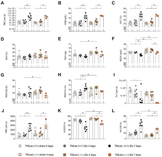 2.3. Altered Erythrocyte Characteristics and Immune Cell Populations in Whole Blood of TMLed (−/−) Stx Mice
