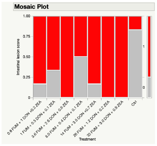 Effect of combined doses of mycotoxins on intestinal lesion score. Three birds from each pen were scored for intestinal lesions on d35, using a 0–3 scale: 0 being normal, 1 indicating a mild mucus covering the small intestine, 2 indicating a necrotic small intestinal mucosa, and 3 indicating sloughed cells and blood in the small intestinal mucosa and contents. Grey bar: lesion score of 0; red bar: lesion score of 1; lesion scores were analyzed with Chi-squared test (p < 0.05).