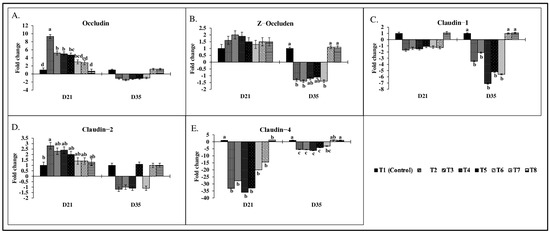 On d21, a similar trend was observed in Claudin-1 mRNA transcription (Figure 3C), but on d35, Claudin-1 transcription was significantly downregulated (p < 0.05) in groups T2 (3.5-fold), T3 (2.1-fold), T4 (7.1-fold), T5 (5.2-fold), and T6 (5.6-fold). On d21, Claudin-2 mRNA expression (Figure 3D) was significantly increased in T2 (2.8-fold) (p < 0.05), but no significant differences were observed on d35 across all treatment groups (p > 0.05). Claudin-4 (Figure 3E) was significantly downregulated across all treatment groups on d21, with T2 groups showing a maximum of a 33-fold reduction (p < 0.05). On d35, Claudin-4 mRNA expression had significantly decreased in the T2, T3, T4, T5, and T6 groups, but groups T7 and T8 had comparable Claudin-4 mRNA transcription to the control groups (p < 0.05).