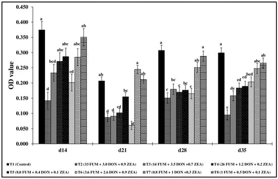 A significant decrease in total bile IgA production was observed across the highest mycotoxin treatment groups and at all time points in this study compared to the control group T1 (p < 0.05) (Figure 5). The T2 group with the highest mycotoxin concentration had the significantly lowest total bile IgA production on d14, d21, d28, and d35, with maximum reduction observed on d14 and d35 compared to the control T1 (p < 0.05). The treatment groups T7 and T8 had comparable IgA levels at all the time points compared to the control T1 (p > 0.05).