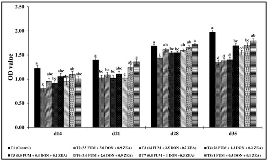 Effect of combined doses of mycotoxins on total bile IgA. Bile samples were analyzed for total IgA at d14, d21, d28, and d35 and expressed as optical density values. Means (+SEM) with no common superscript differ significantly (p < 0.05) (n = 6).