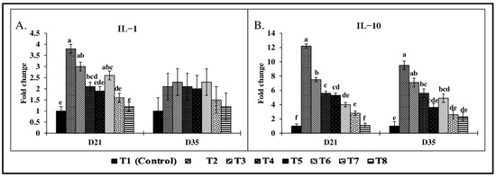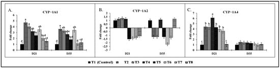 There were significant (p < 0.05) treatment effects on liver CYP-1A1, CYP-1A4, IL-1, and IL-10 mRNA expression on both d21 and d35 (Figure 6 and Figure 7). On d21, CYP-1A1 mRNA expression (Figure 6A) in the T2 group showed a 4.7-fold increase compared to the control group. There were no significant differences observed in CYP-1A2 mRNA expression (Figure 6B) on d21 and d35 across all treatment groups (p > 0.05). On d21, there were significant (p < 0.05) increases in CYP-1A4 mRNA expression (Figure 6C) across treatment groups. Birds in the T2 and T4 groups showed significantly increased CYP-1A4 expression (4.4-fold; 6.1-fold) compared to the control group. Similarly, IL-1 expression (Figure 7A) in the T2 group was significantly increased by 3.8-fold (p < 0.05), while IL-10 expression (Figure 7B) was upregulated by 12.2-fold compared to the control (p < 0.05). A similar trend was observed on d 35, with a 9.5-fold increase in IL-10 mRNA expression and a 3.6-fold increase in CYP-1A1 expression in the T2 group compared to the control group (p < 0.05).