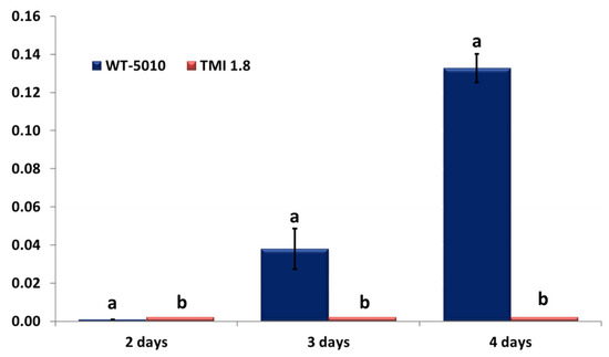Expression of AclaeA gene normalized with beta-tubulin gene expression in the ΔAclaeA TMI 1.8 and wild-type Ac-5010 strains. The statistical analysis was performed for each day separately, and the different letters indicate the statistically significant differences between the wild strain Ac-5010 and the ΔAclaeA strain TMI1.8 after one-way ANOVA followed by Tukey’s multiple comparison post hoc test (p < 0.05).