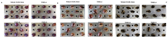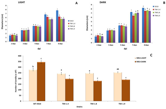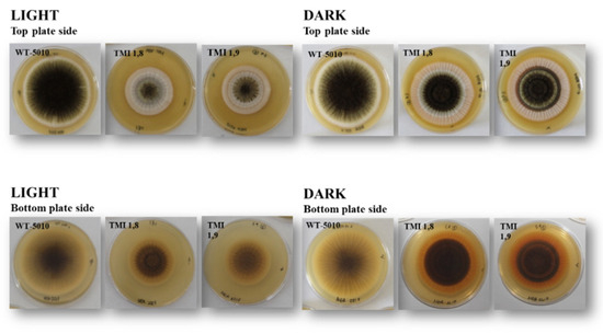 In order to assess the physiological characteristics (growth and colony morphology) of ΔAclaeA mutants compared to the Ac-5010 wild type, all strains were grown in non-selective media (MEA plates) under light and dark conditions. Three ΔAclaeA mutants, TMI1.4, TMI1.8, and TMI1.9, were used. The colonies of ΔAclaeA mutants consisted of a compact white basal mycelial colony covered by a layer of dark black conidia heads showing marked radial grooves that were not present in the wild-type strain. Another interesting finding was the concomitant presence of exudates from the colonies when the ΔAclaeA mutants TMI1.4, TMI1.8, and TMI1.9 were incubated in darkness (Figure 2).