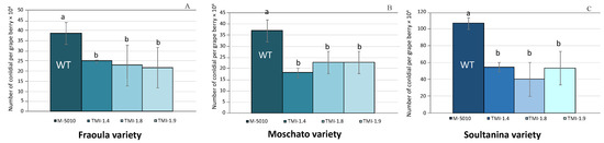 The role of the AclaeA gene in the pathogenicity and virulence of A. carbonarius was further investigated by testing the ability of Ac-5010 wild strain and ΔAclaeA strains TMI1.4, TMI1.8, and TMI1.9 to cause disease in three different grape varieties: cv. Fraoula, cv. Soultanina, and cv. Moschato. Three replicates were used for each pathogenicity test, and each replicate consisted of 8 berries. Artificial inoculation was performed using 40 μL conidia suspension (104 conidia/mL) on each slightly wounded fruit. Control grape berries were treated with sterilized water. After inoculation, the berries were placed in plastic sterile transparent boxes and kept at 28 °C with a 12 h photoperiod. After 6 days, infected grape berries were placed in 50 mL Falcon tubes and homogenized in sterile water, and the amount of conidia was measured per berry.