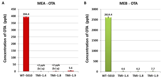 The effect of deletion of the AclaeA gene was also evaluated in OTA biosynthesis in A. carbonarius strains. The production of OTA was quantified via HPLC and was decreased drastically in ΔAclaeA strains compared to wild-type strain Ac-5010 on both (MEA and MEB) substrates. On the MEA medium, the wild strain produced 394.4 ppb, whereas on ΔAclaeA strains TMI 1.4 and TMI 1.8, the OTA production was below the limit of quantification (2 ppb) of the method. In strain TMI 1.9, the production of OTA was 5.6 ppb. In the MEB medium, the wild strain Ac-5010 produced 2614.4 ppb, whereas the ΔAclaeA strains TMI1.4, TMI1.8, and TMI1.9 produced 4.6, 4.2, and 7.7 ppb, respectively (Figure 6). These results indicate that the AclaeA gene is essential for OTA production in A. carbonarius.