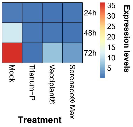 AcLaeA is repressed after the application of the biopesticides Trianum-P®, Vacciplant®, and Serenade®, as revealed by qRT-PCR. Heatmap shows the quantification of AclaeA expression level at each time point and was determined by first normalizing the target RNA to the internal standard RNA (tubulin).