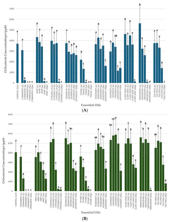 OTA produced (ppb) by A. carbonarius strains Ac-5010 (A) and Ac-29 (B) in MEA plates amended with different concentrations of each EO concentration. The statistical analysis was performed for each EO separately compared to the non-amended plate. The different letters indicate statistically significant differences between the different concentrations of each EO and the control after one-way ANOVA followed by Tukey’s multiple comparison post hoc test (p < 0.05).