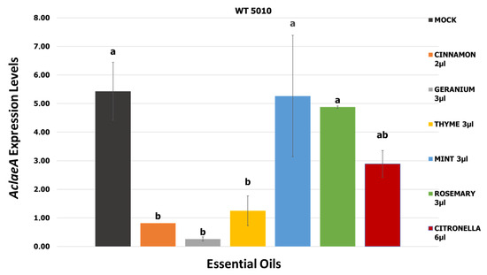 AcleaA expression levels post-EO application at specific concentrations in MEA medium, including expression levels for the control of the experiment (mock with wild-type strain Ac-5010). Statistical analysis was performed using one-way ANOVA followed by Tukey’s multiple comparison post hoc test (p < 0.05). Letters above the graphs indicate differences between treatments (p < 0.01).