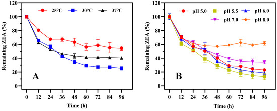 The biotransformation characteristics of strain 1101 under various conditions. ZEA biotransformation curves of strain 1101 at different temperatures (A) and pH levels (B), where the minimal salt medium containing 10 μg/mL ZEA was used to determine the biotransformation efficiency of strain 1101. Error bars represent standard deviations.