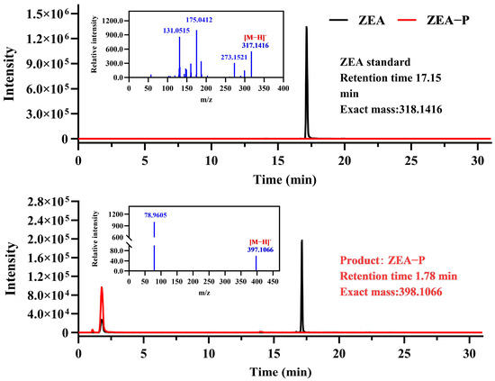 LC-TOF-MS/MS analysis of ZEA biotransformation products (ZEA-P) following incubation with purified recombinant ZPH1101. Secondary mass spectrometry data indicated that the negative ion ESI-MS spectrum displayed significant fragment ions, including deprotonated ZEA at m/z 317.1416 ([M-H]−), the phosphate group at m/z 78.9605 ([M-H]−), and the phosphorylated product at m/z 397.1066 ([M-H]−).