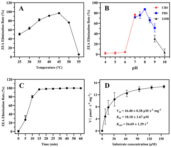 We investigated the effects of temperature, pH, reaction time, and metal ions on enzyme activity of ZPH1101. The results showed that the ZPH1101 activity initially increased and then decreased across a reaction temperature range of 25 to 55 °C, with an optimal temperature of 45 °C (Figure 3A). ZPH1101 exhibited maximum activity at pH 8.0, with significant decreases in catalytic activity observed below pH 7.0 or above pH 9.0 (Figure 3B). ZPH1101 achieved a conversion rate of over 95% of ZEA within 15 min under optimal temperature and pH conditions (Figure 3C). The enzyme kinetic parameters Vmax, Km, and kcat were determined using the Michaelis–Menten model under optimal conditions (Figure 3D), and the calculated values were 16.40, 18.18, and 54.69, respectively.