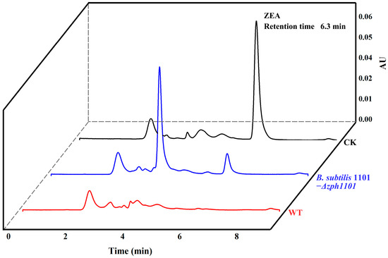 HPLC analysis of residual ZEA after 8 h of biotransformation by wild-type B. subtilis 1101 and its knockout mutant. The black line corresponds to the blank control, while the red and blue lines represent the wild-type strain and the knockout mutant, respectively.