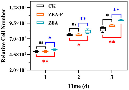 Effects of ZEA and ZEA-P on the proliferation of MCF-7 cells. CK represents the untreated group, while the ZEA and ZEA-P treatment groups were treated at a concentration of 10 nmol/L. Significant differences between treatment groups are indicated as follows: * p < 0.05, ** p < 0.01; ns, not significant. Each reported value represents the means ± SD (n = 3).