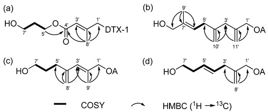 COSY (bold lines), key HMBC (arrows) correlations in the diol moiety of (a) compounds 1, (b) 2, (c) 3, and (d) 4.