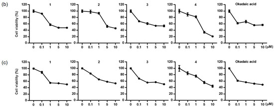 Cytotoxic effects of compounds 1–4 and okadaic acid on Neuro-2a (a), HCT116 (b), and HepG2 (c) cells.