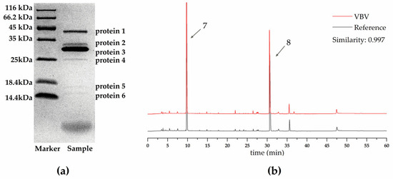 Quality evaluation of collected Vespa bicolor venom (VBV) samples, including (a) analysis of protein components by SDS-PAGE electrophoresis and (b) HPLC fingerprint analysis.