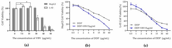 In vitro efficacy of VBV as a treatment for liver cancers either as a monotherapy or in conjunction with the chemotherapeutic drug cisplatin (DDP). (a) Cytotoxic effects of varying concentrations of VBV on HepG2 cells and L-02 cells. (b) Comparative analysis of the cytotoxicity of DDP alone versus its combination with 15 µg/mL VBV on HepG2 cells. (c) Comparative analysis of the cytotoxicity of DDP alone and in combination with 15 µg/mL VBV on L-02 cells. Data are expressed as means ± SD. Each experiment represents the mean values of six independent experiments. * p < 0.05 compared with negative controls.