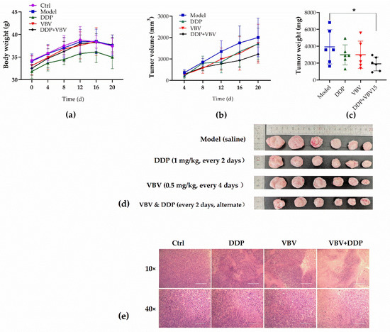Tumor-suppressive effects of VBV alone and in combination with DDP in the murine model. (a) Weight changes of mice across different treatment groups over 20 days after tumor implantation. (b) Changes in tumor volume among the treatment groups. (c) Tumor weights in each group following 20 days of drug treatment. (d) Images of tumor tissue in each experimental group. (e) HE stained images of tumors in each experimental group. Data represent mean ± SD; n = 6 mice/group. * p < 0.05, significant difference.