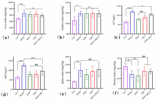 Hepatorenal toxicity and immunomodulatory effects of VBV alone and in combination with DDP evaluated in a murine model. Following 20 days of various drug treatments, we analyzed the differences in the following: (a) liver index, (b) kidney index, (d) spleen index, and (e) thymus index (f), as well as (c) ALT and (d) AST levels in serum among the different groups of mice. Data represent mean ± SD; n = 6 mice/group. * p < 0.05, ** p < 0.01, *** p < 0.001, significant difference; ns, no significant difference.