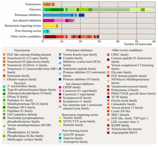 Putative toxin families/domains identified in the transcriptome of Kulikovia alborostrata. The figure illustrates the proportional distribution of toxin family’s/domain’s transcripts in the transcriptome.