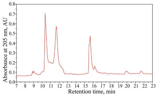 For proteomic analysis, mucus samples of nine specimens of K. alborostrata were used. Preliminary assessment of the mucus composition was performed using reversed-phase high-performance liquid chromatography (RP-HPLC). Up to 19 peaks were resolved in K. alborostrata mucus samples (Figure 2). Total peak area varied from 58.4 to 152.5 AU*μL, yielding mean total protein concentration of 30.0 ± 16.7 μg/mL (mean ± sd).