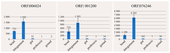 Gene expression for three putative toxic peptides (ORF|076246, ORF|006024, ORF|001200) was evaluated in the head, integument, proboscis, intestines, and gonads of K. alborostrata by qRT-PCR (Figure 3). The proboscis was used as calibrator. A significantly higher transcription level in the head and integument was observed for all the selected genes. The highest transcription level (in two of three biological replicates) was observed for nemertide alpha-1 toxin (ORF|076246).