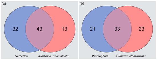 Venn diagram showing the number of putative toxin gene families shared between Kulikovia alborostrata and all nemerteans (a) and K. alborostrata and pilidiophorans (b).